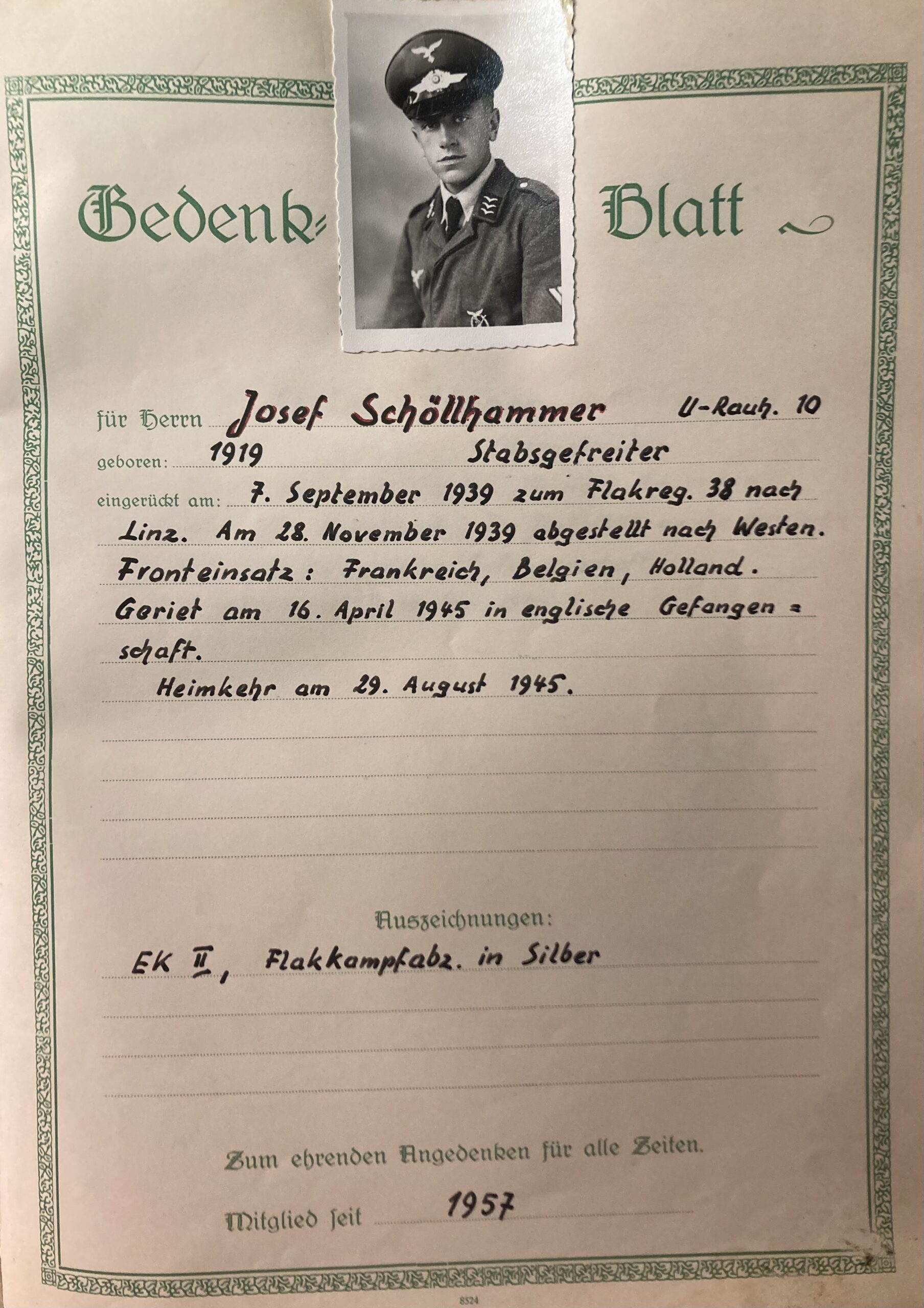 Josef Schöllhammer (vulgo Schwaighofer) wurde am 6. Dezember 1919 in Grünbach geboren. Im Alter von 19 Jahren bekam er seinen Einberufungsbefehl und wurde zur Wehrmacht einberufen. So musste er eine Woche nach Kriegsausbruch, am 7. September 1939, zum Flak-Regiment 38 nach Linz einrücken.