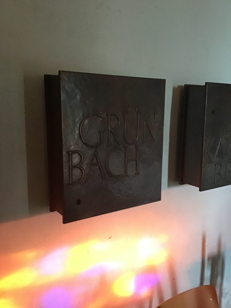Am Wegrand trifft man auf dieses kunstvoll geschmiedete Eisenkreuz mit Korpus, Laterne und einer geschmiedeten Girlande. Eine traurige Begebenheit kann man auf dem am Kreuz befestigten Schild lesen …
